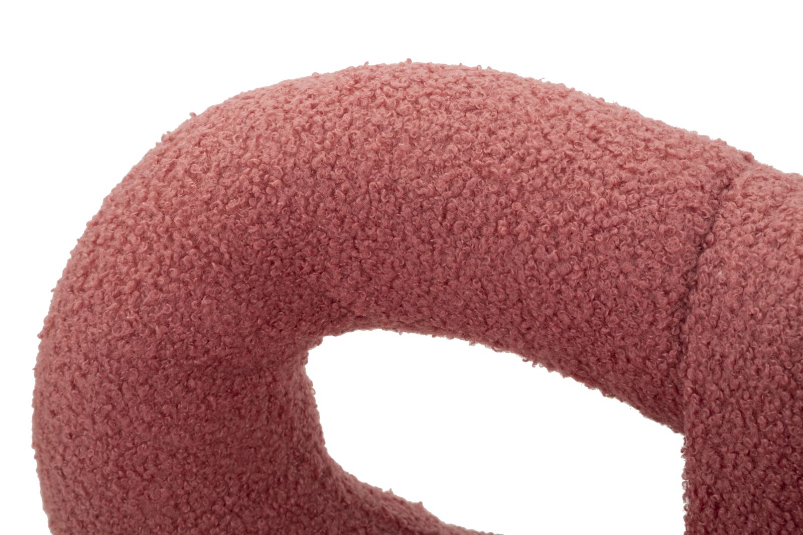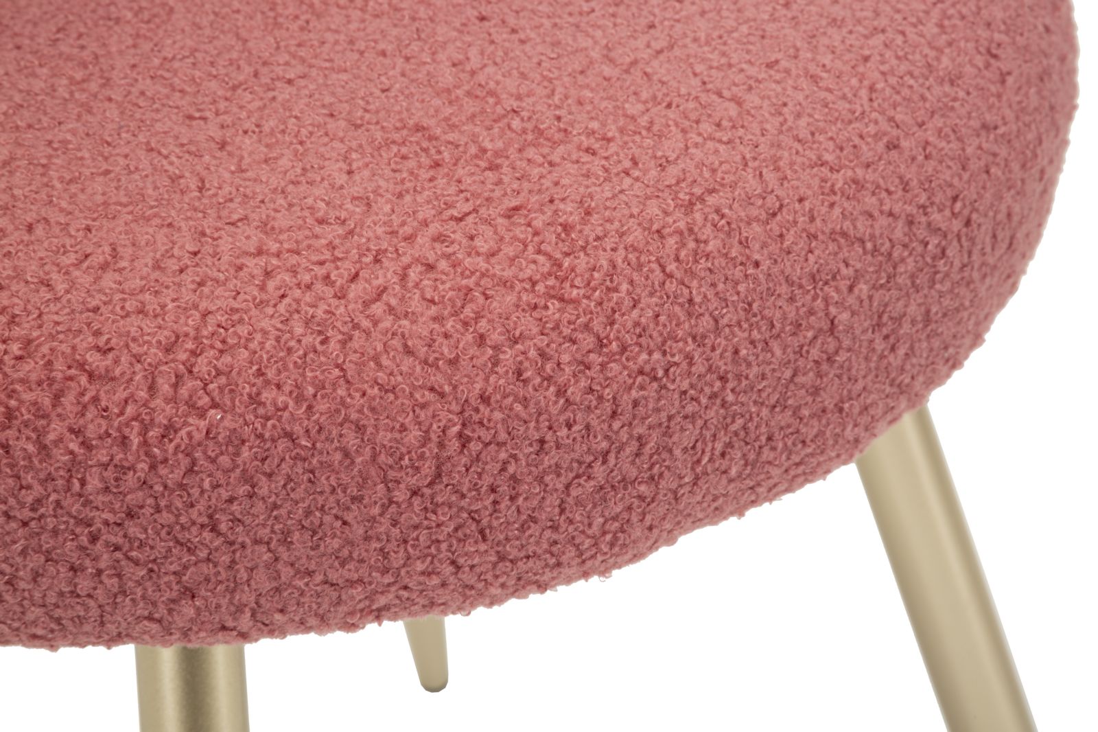 Silla Mini Ilary rosa, con respaldo moldeado y patas doradas, tapizada en tejido bouclé. Perfecta para añadir un toque glamuroso y femenino a cualquier ambiente.