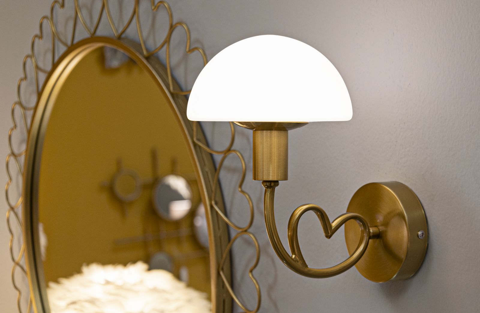• Aplique de metal dorado con elegante corazón y pantalla de cristal blanco mate.