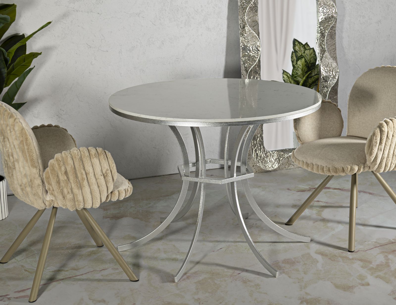 • Mesa de comedor Istanbul, líneas suaves y estructura plateada con tapa con efecto mármol. Perfecta para dar luminosidad y estilo a cualquier comedor.
