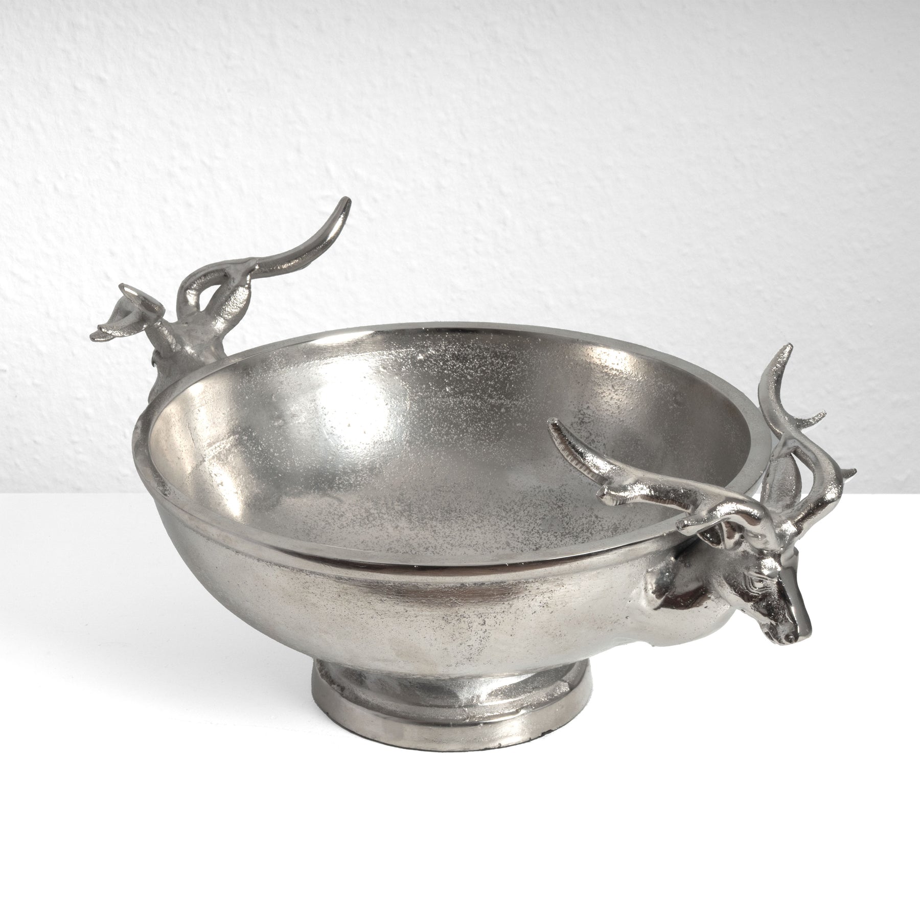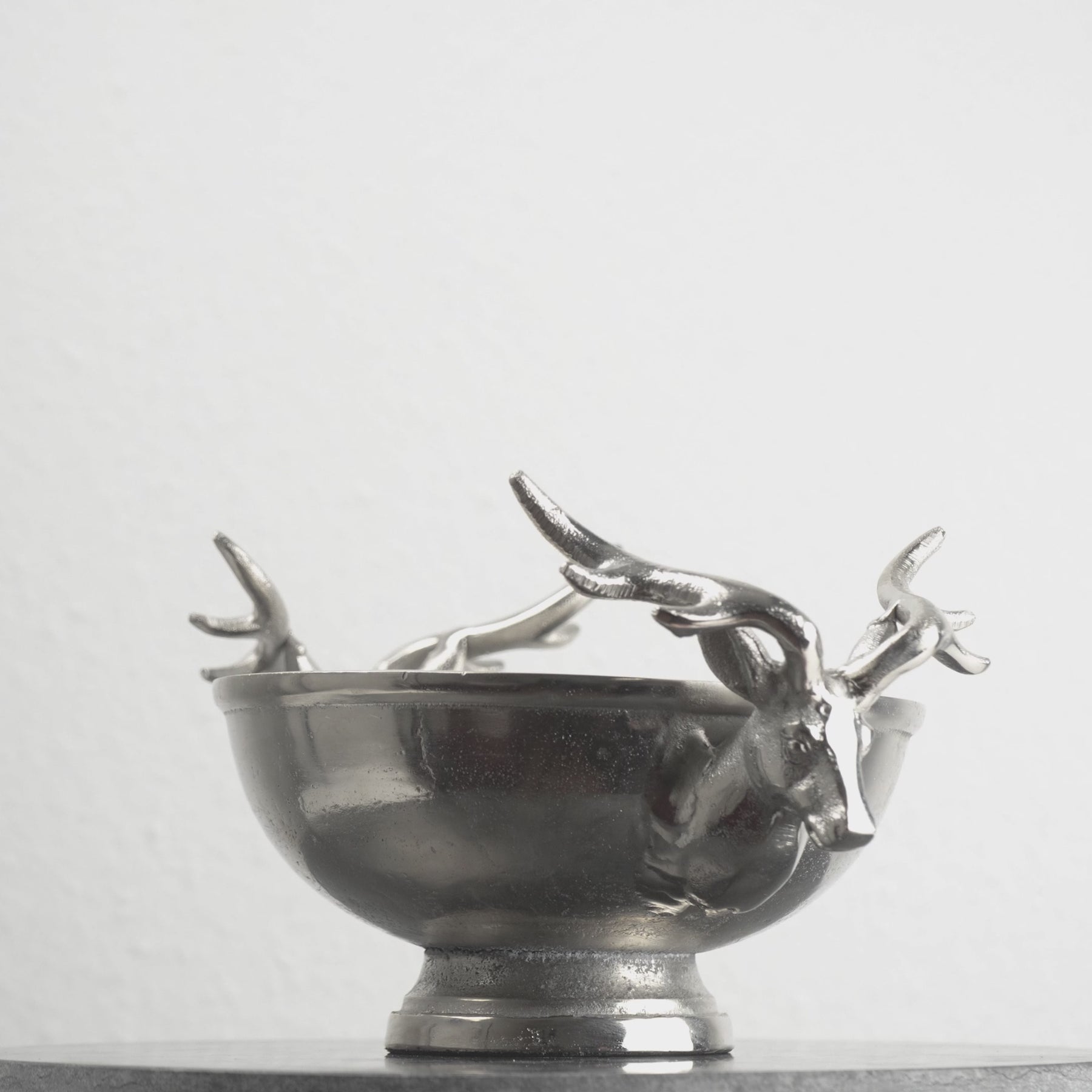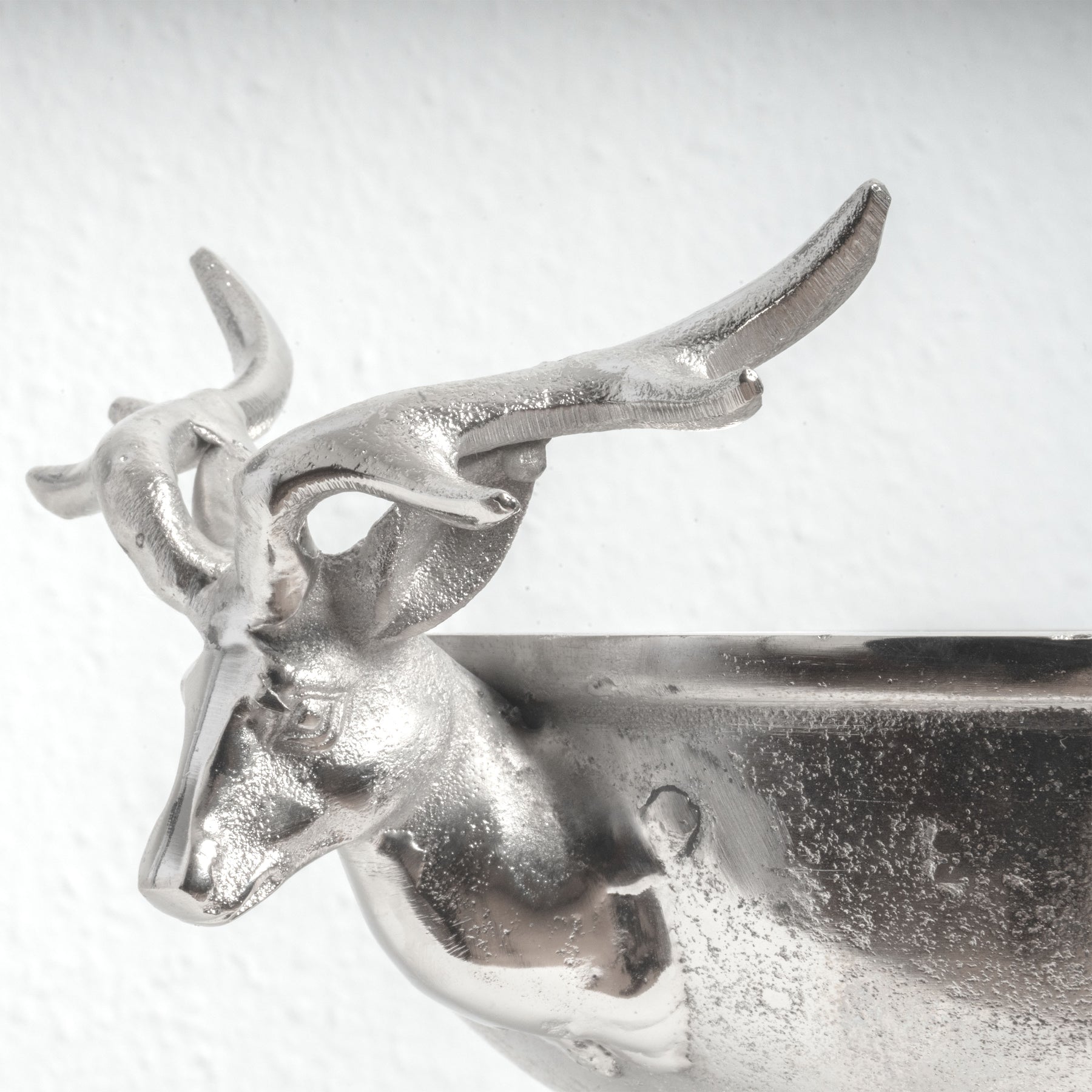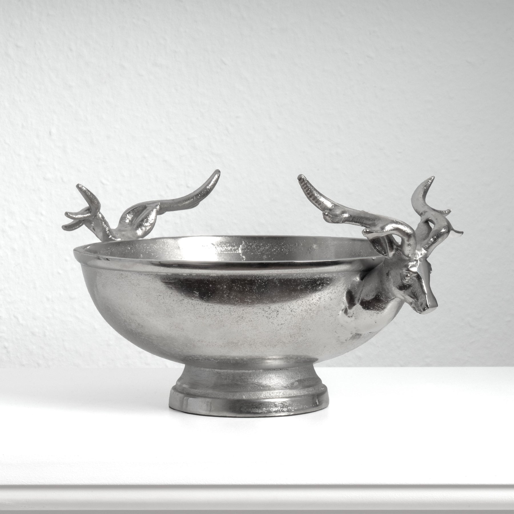 • Aporta un toque de sofisticación y encanto natural a tu hogar con este cuenco decorativo plateado adornado con cabezas de ciervo esculpidas. Su forma elegante y los detalles intrincados evocan la elegancia atemporal de los lodges clásicos, combinando fuerza y refinamiento en una pieza central espectacular.