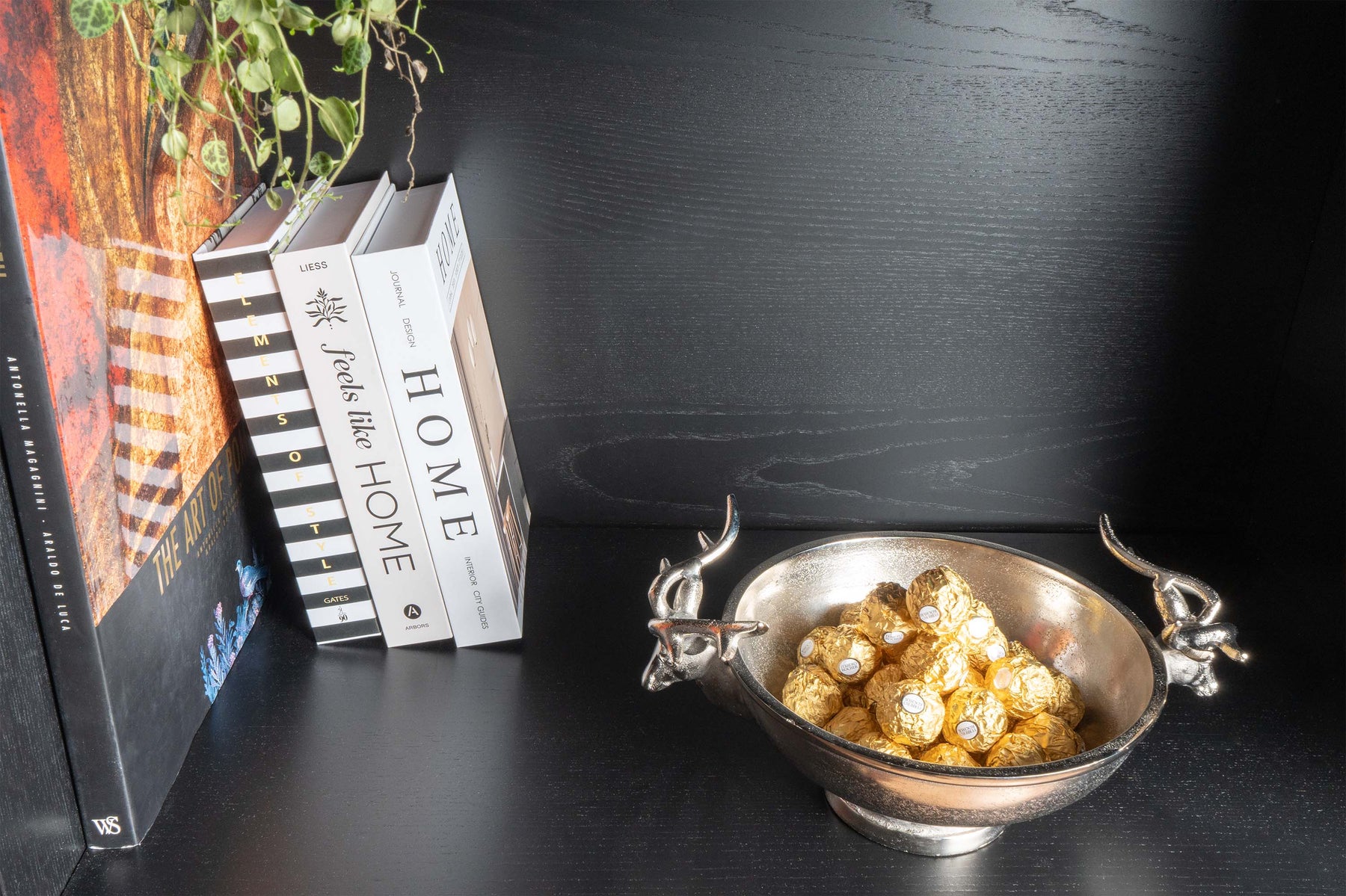 Perfecto para decorar mesas de comedor, consolas o repisas, este cuenco funciona tanto como elemento funcional como acento decorativo. Las cabezas de ciervo simbolizan la gracia y la armonía con la naturaleza, lo que lo convierte en una adición ideal para interiores rústicos o contemporáneos.