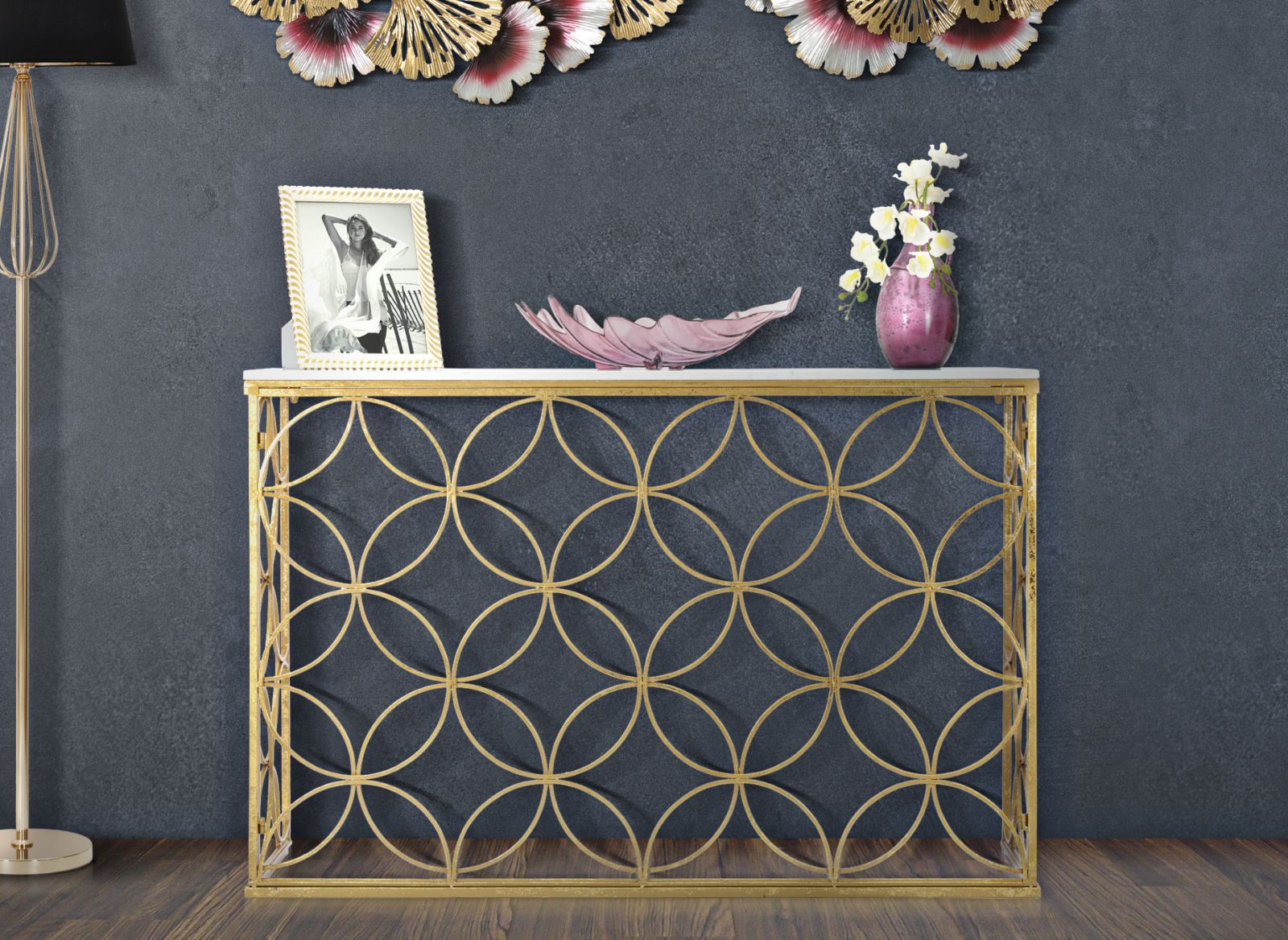 Mesa Consola Geométrica de Metal Dorado con Tapa de Mármol