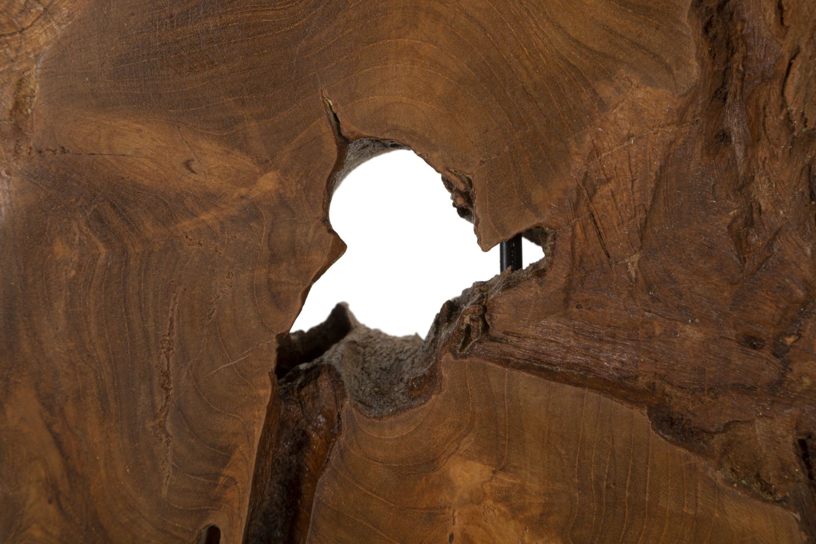 Lámpara de teca reciclada, hecha a mano a partir de un trozo de tronco. Cada lámpara es única, con vetas que cuentan la historia de la madera, creando un ambiente acogedor y natural.