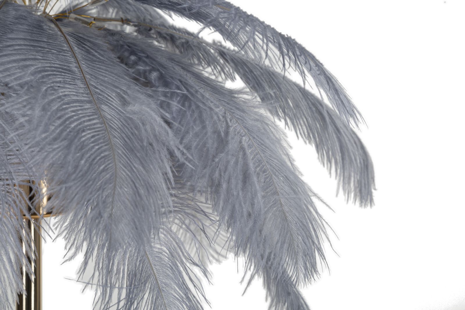• Lámpara de mesa de metal dorado con 2 puntos de luz y pantalla compuesta por plumas blancas.