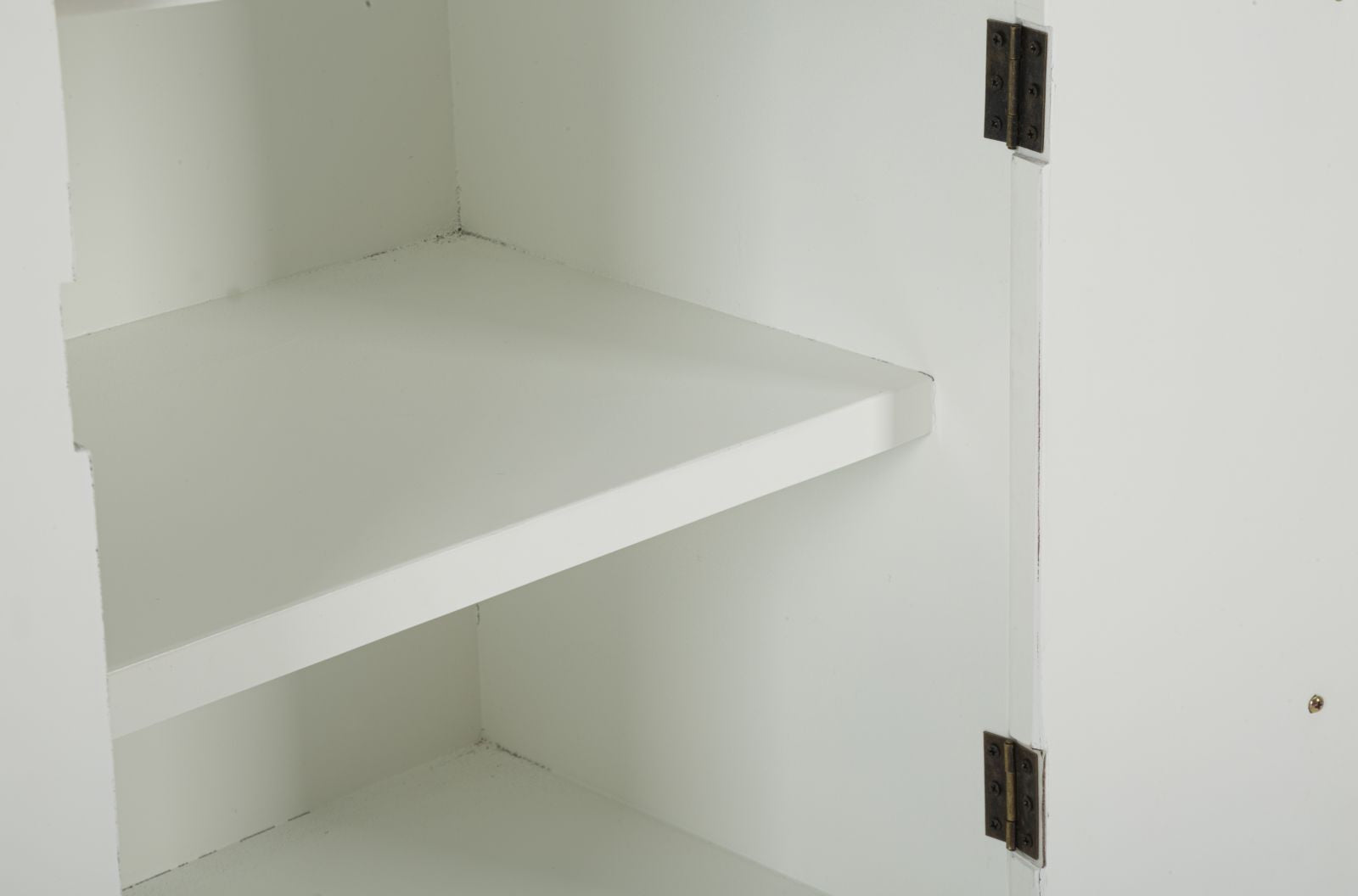 Armario ovalado de madera blanca con tapa e inserciones de madera marrón con un diseño redondeado. Finamente decorado con líneas en relieve. Completo con 2 puertas.