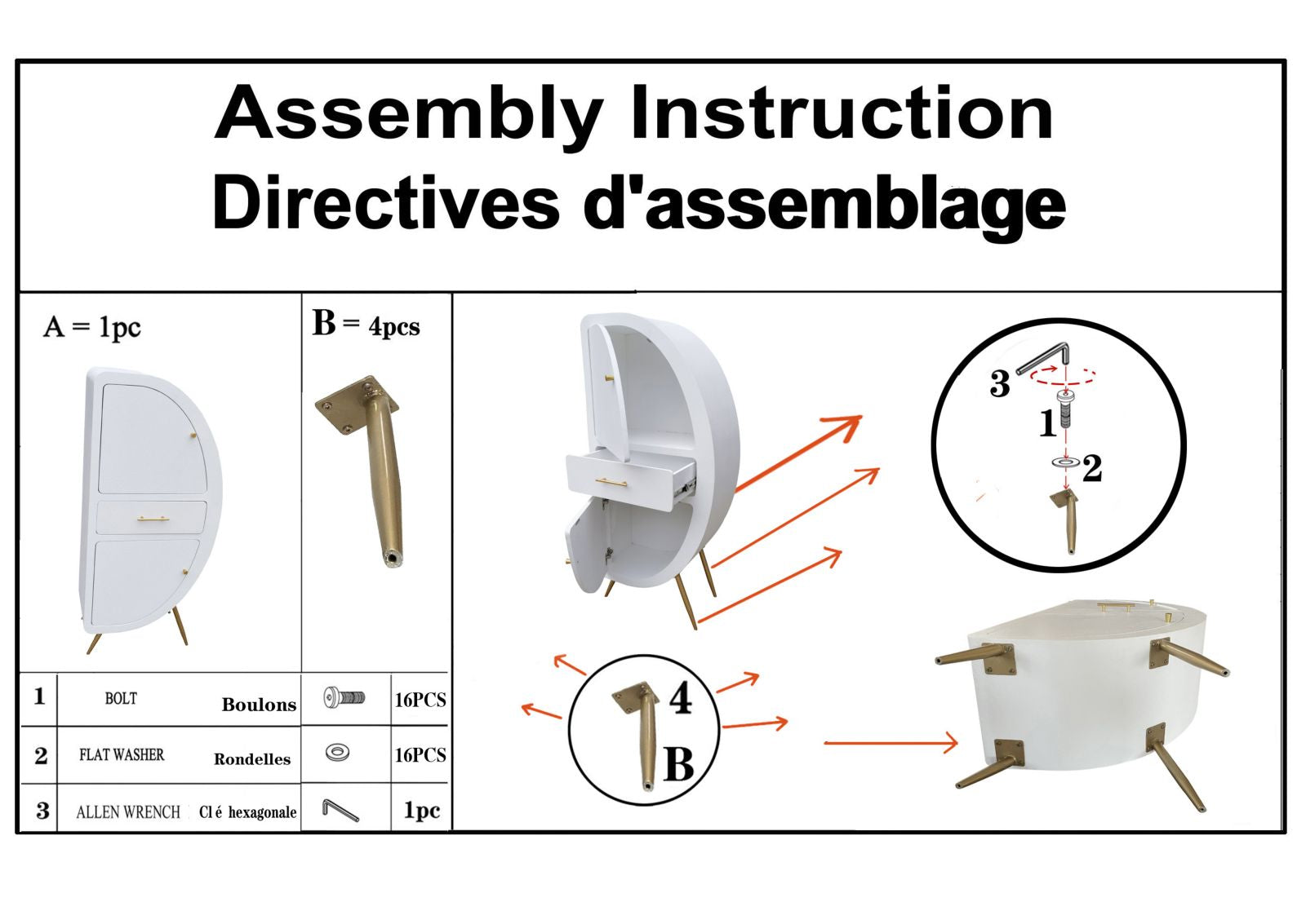• Mueble de madera blanca con líneas redondeadas que recuerdan las antigüedades modernas de los años 70. Completo con 2 puertas y cajón. Patas metálicas doradas para montar.