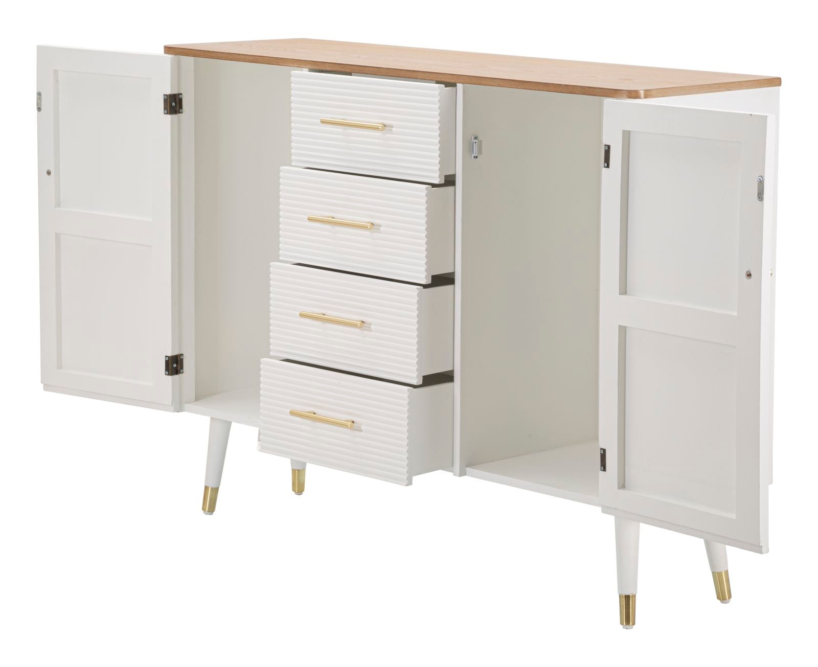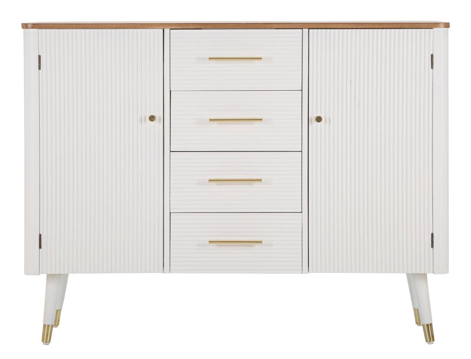 • Armario de madera blanco de líneas sencillas y esenciales. Completo con 2 puertas y 4 cajones y tapa de madera marrón. Los tiradores y patas de metal dorado aportan un toque de clase.