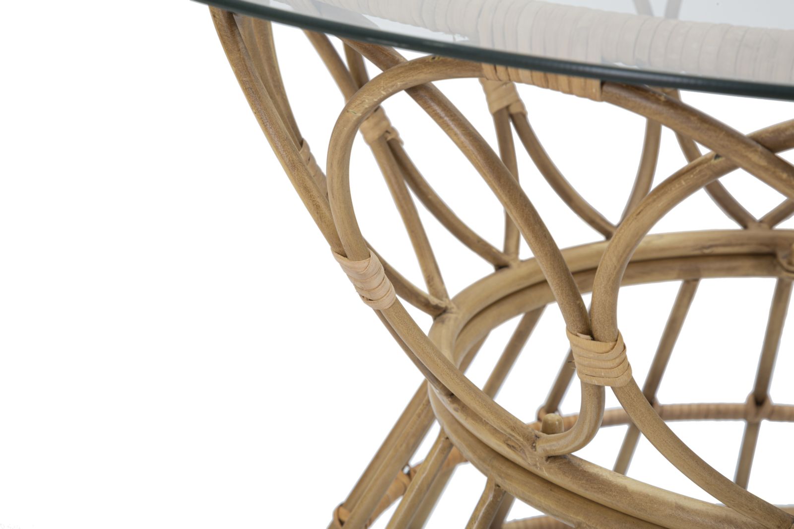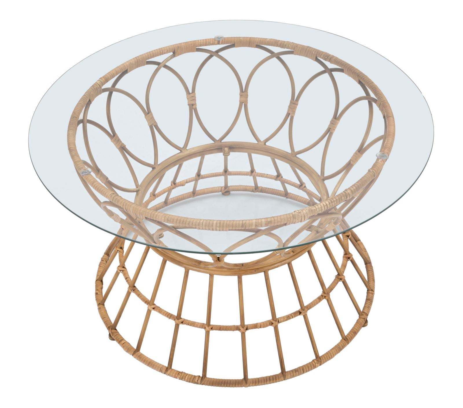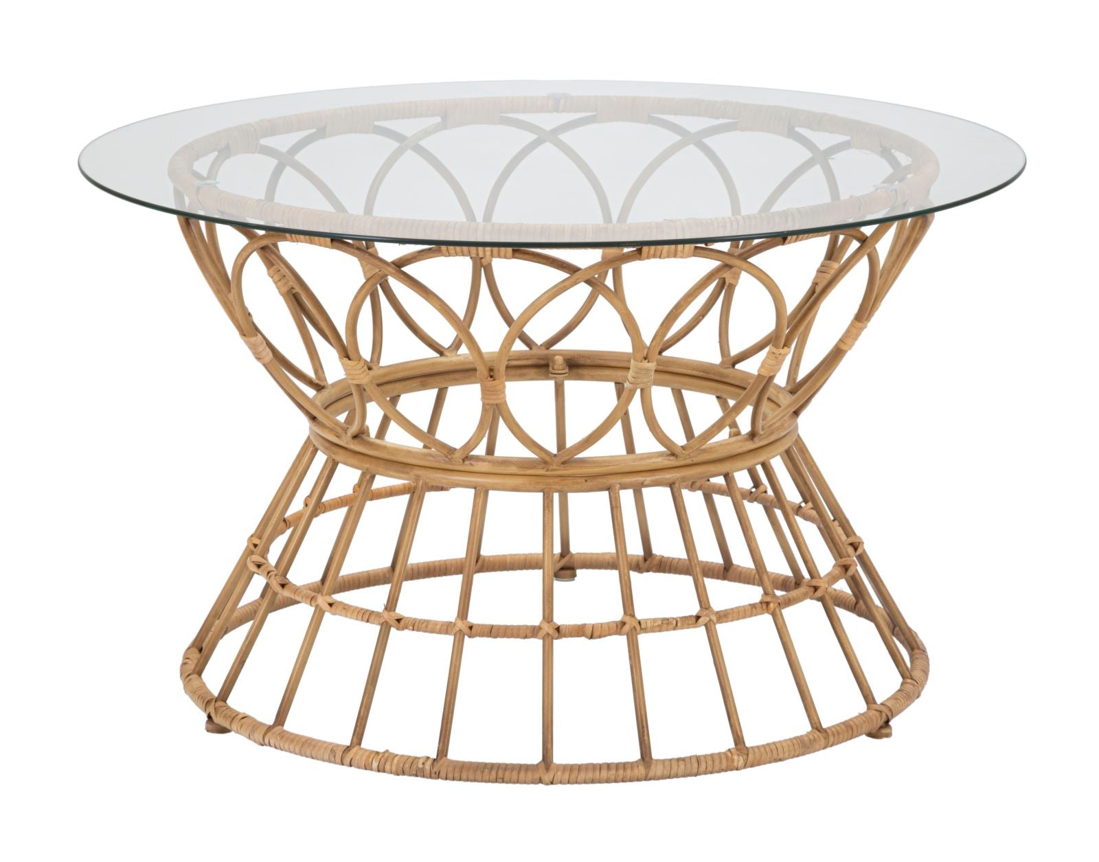 • Mesa de centro redonda de metal con acabados de ratán y tapa de cristal. El diseño sencillo y geométrico la hace adecuada para cualquier tipo de mobiliario.