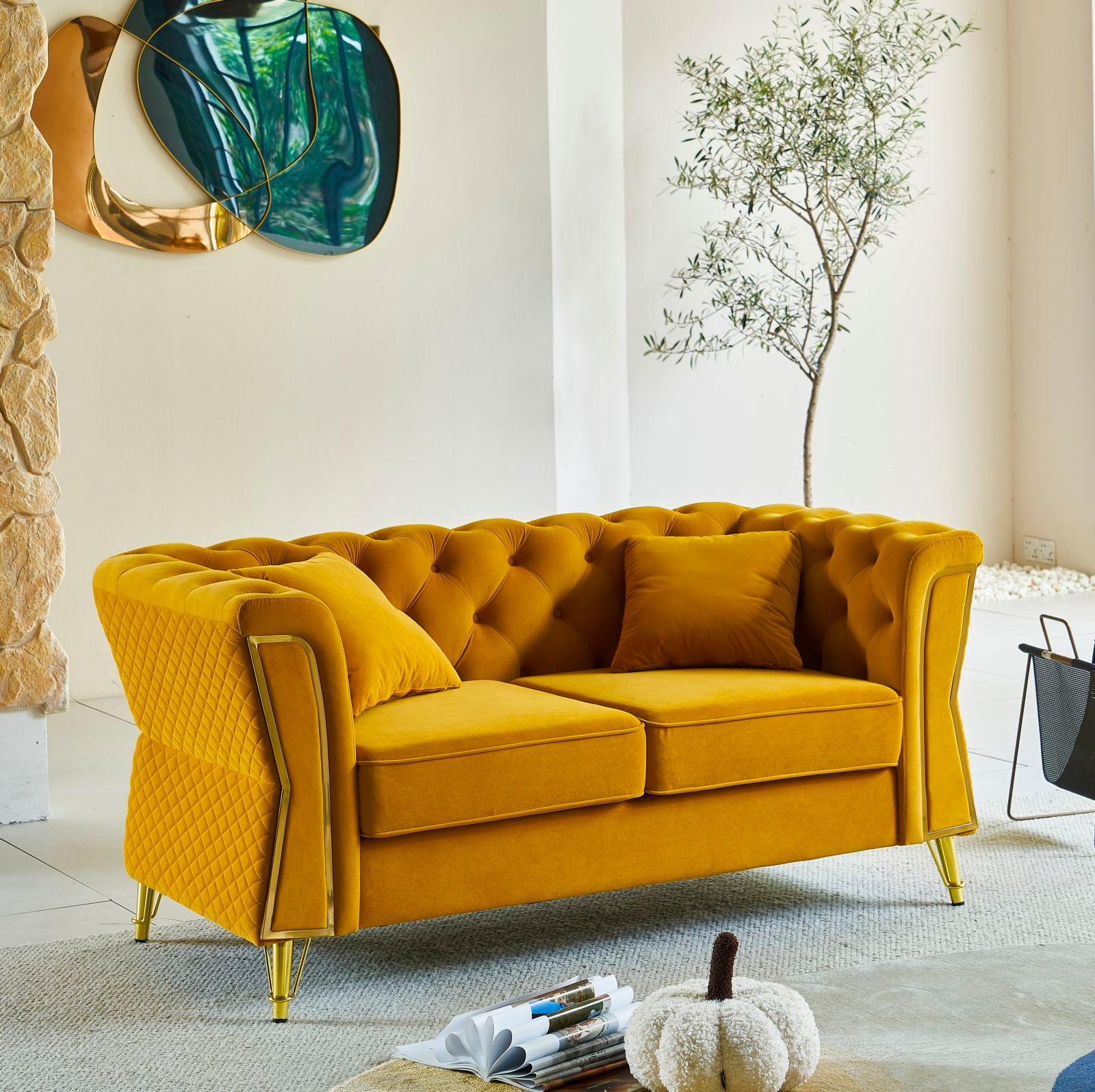 Sofá de dos plazas de color ocre con patas doradas para montar, tapizado en terciopelo acolchado. Ideal para ambientes modernos y refinados, aporta un toque de lujo y comodidad.