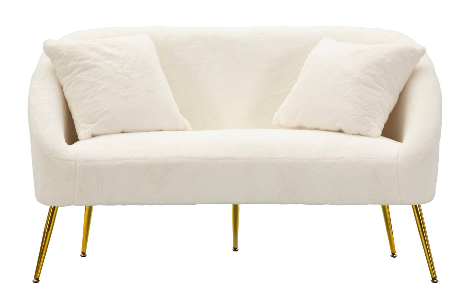 Sofá blanco de dos plazas con patas doradas para montar, tapizado en suave piel sintética. Ideal para ambientes modernos y refinados, aporta un toque de lujo y comodidad.
