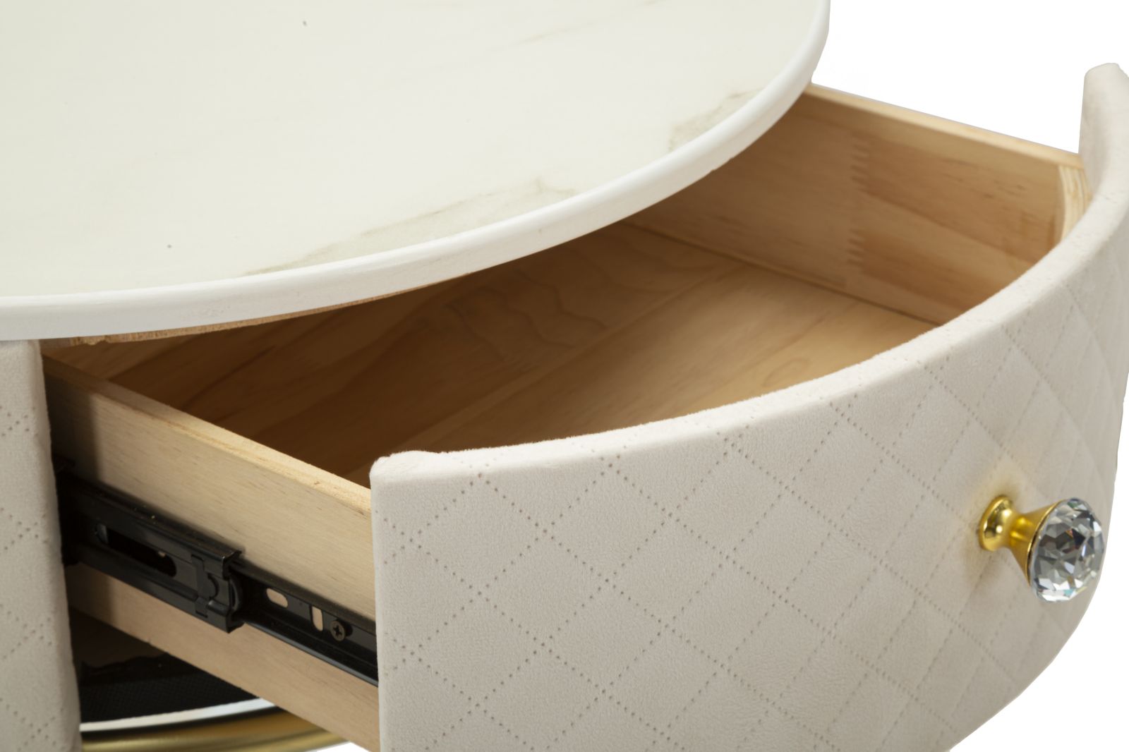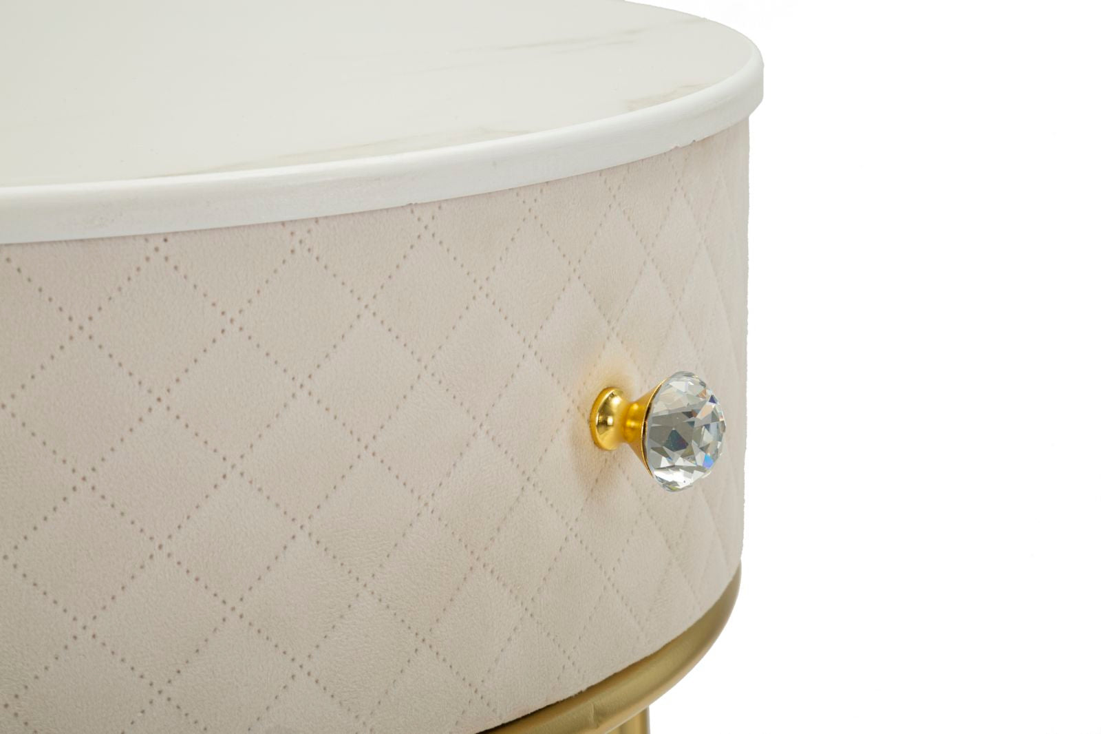 • Mesita de noche/tocador con un diseño refinado, con puf a juego, tapizado en terciopelo crema y detalles dorados. Perfecto para añadir un toque chic a dormitorios y rincones de belleza.