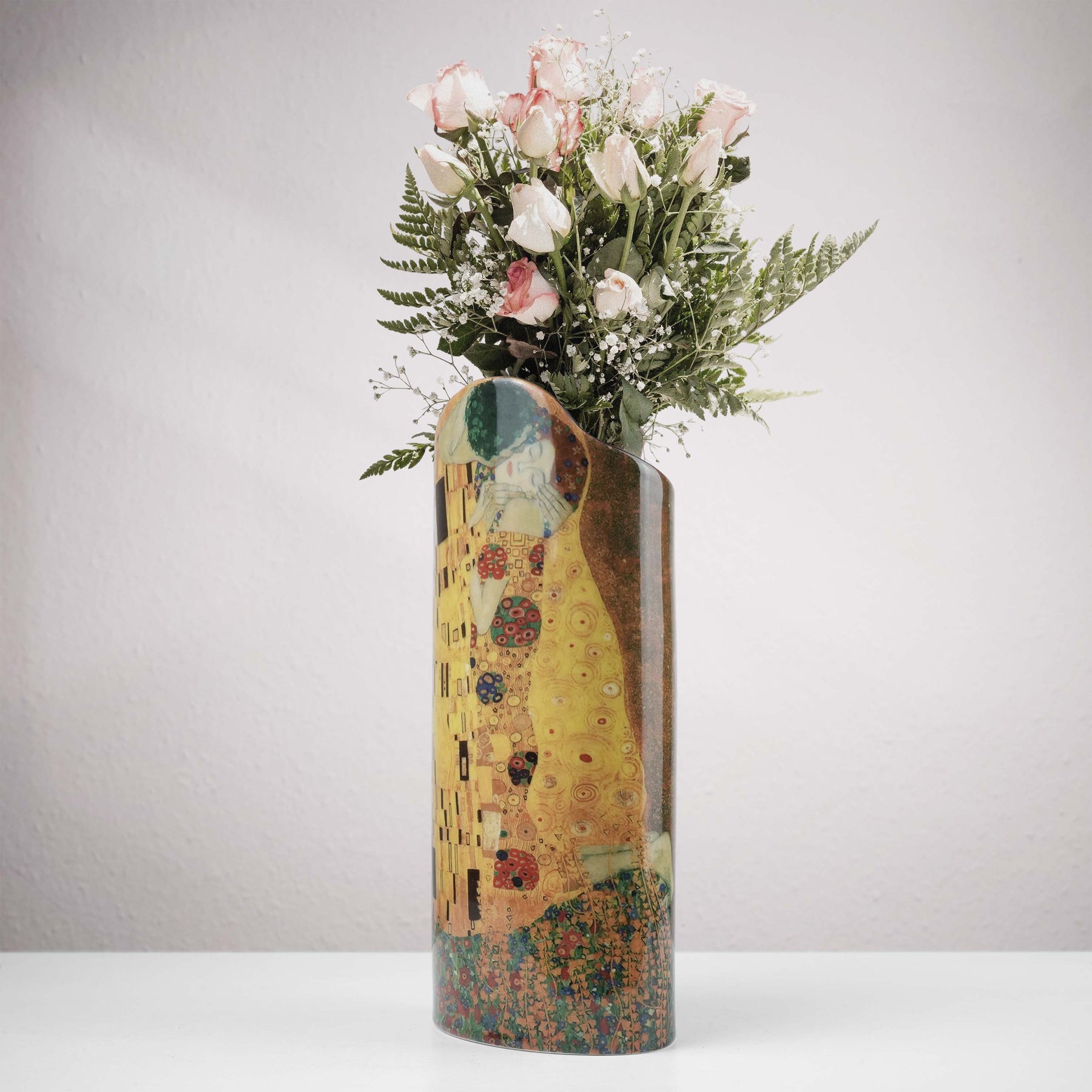 • Celebra el romance atemporal con este jarrón decorativo que representa la obra maestra de Gustav Klimt El Beso. Irradiando tonos dorados e intrincados patrones Art Nouveau, esta elegante pieza trae la pasión y la belleza ornamental de la Viena de principios del siglo XX a su hogar. Un lujoso detalle para los amantes del arte y un regalo perfecto para ocasiones especiales.