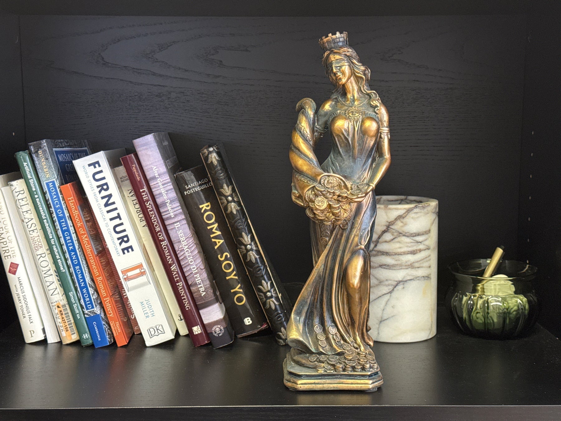 Nuestras esculturas con acabado en latón ennegrecido están fabricadas con una base de resina resistente y de diseño, recubierta por expertos con una capa metálica con efecto latón. Esta técnica consigue el aspecto lujoso del latón envejecido, al tiempo que mantiene una estructura ligera y resistente, ideal para piezas decorativas con detalles.
