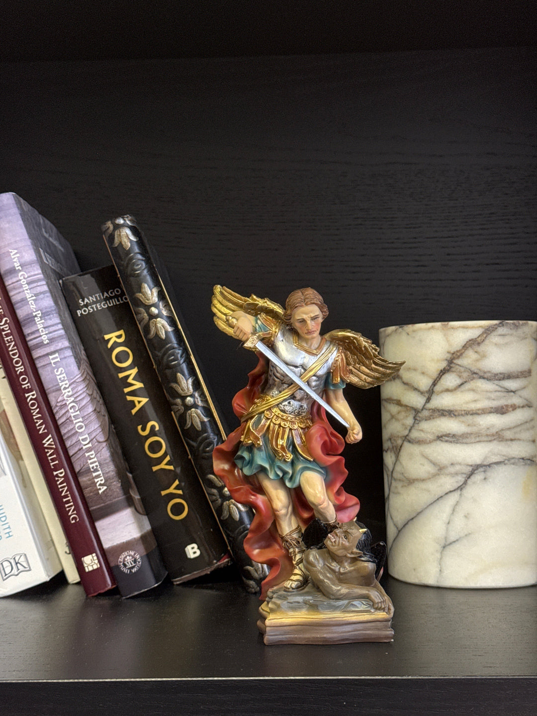 • La escultura del Arcángel San Miguel representa la protección divina y la fuerza celestial. Más allá de su simbolismo religioso, aporta majestuosidad a cualquier espacio. Ideal para coleccionistas o quienes buscan inspiración espiritual, sus finos detalles evocan coraje y justicia. Perfecta para colocar en una repisa o rincón de oración, esta figura recuerda la eterna lucha entre el bien y el mal. Una elección significativa para quienes buscan consuelo y guía divina en su entorno.