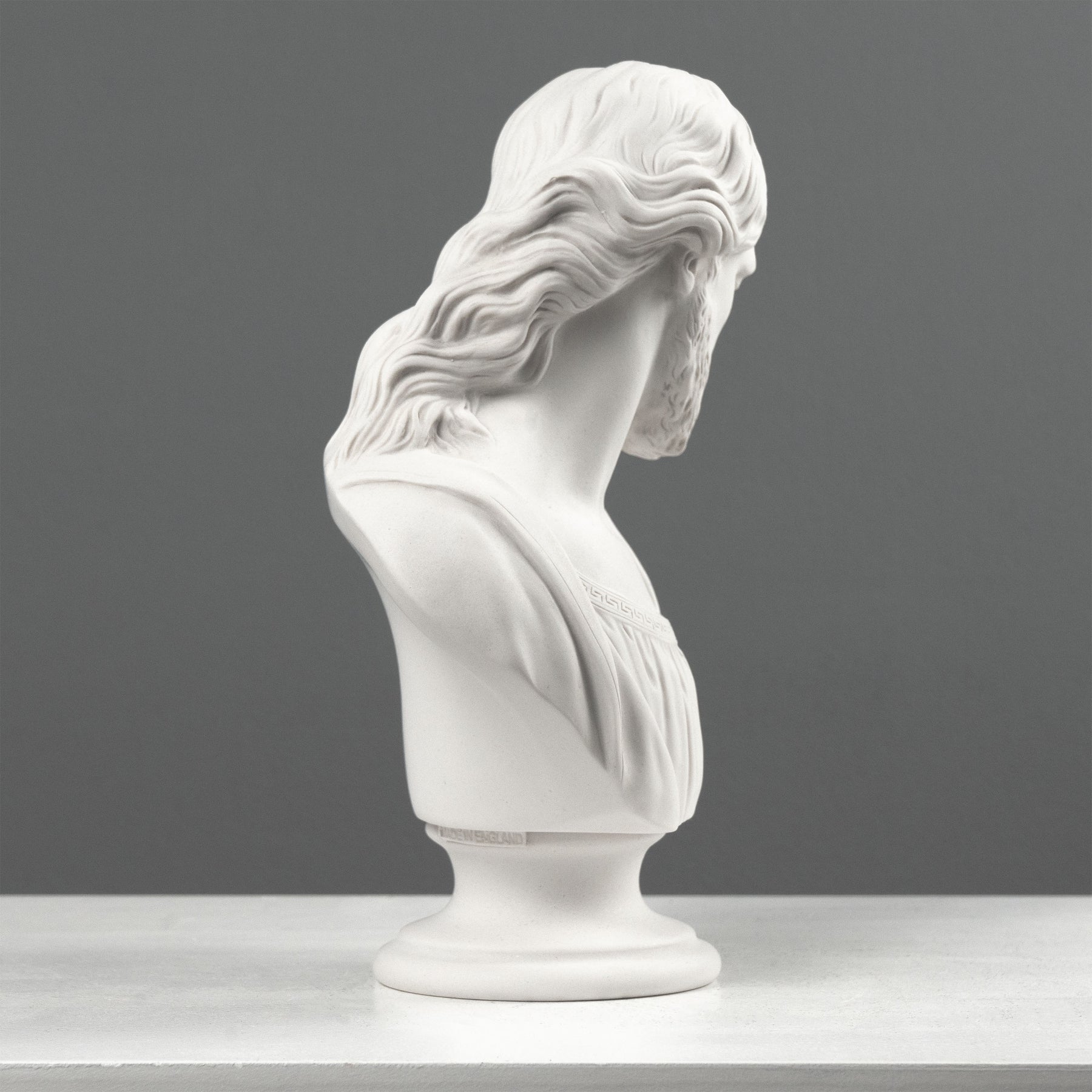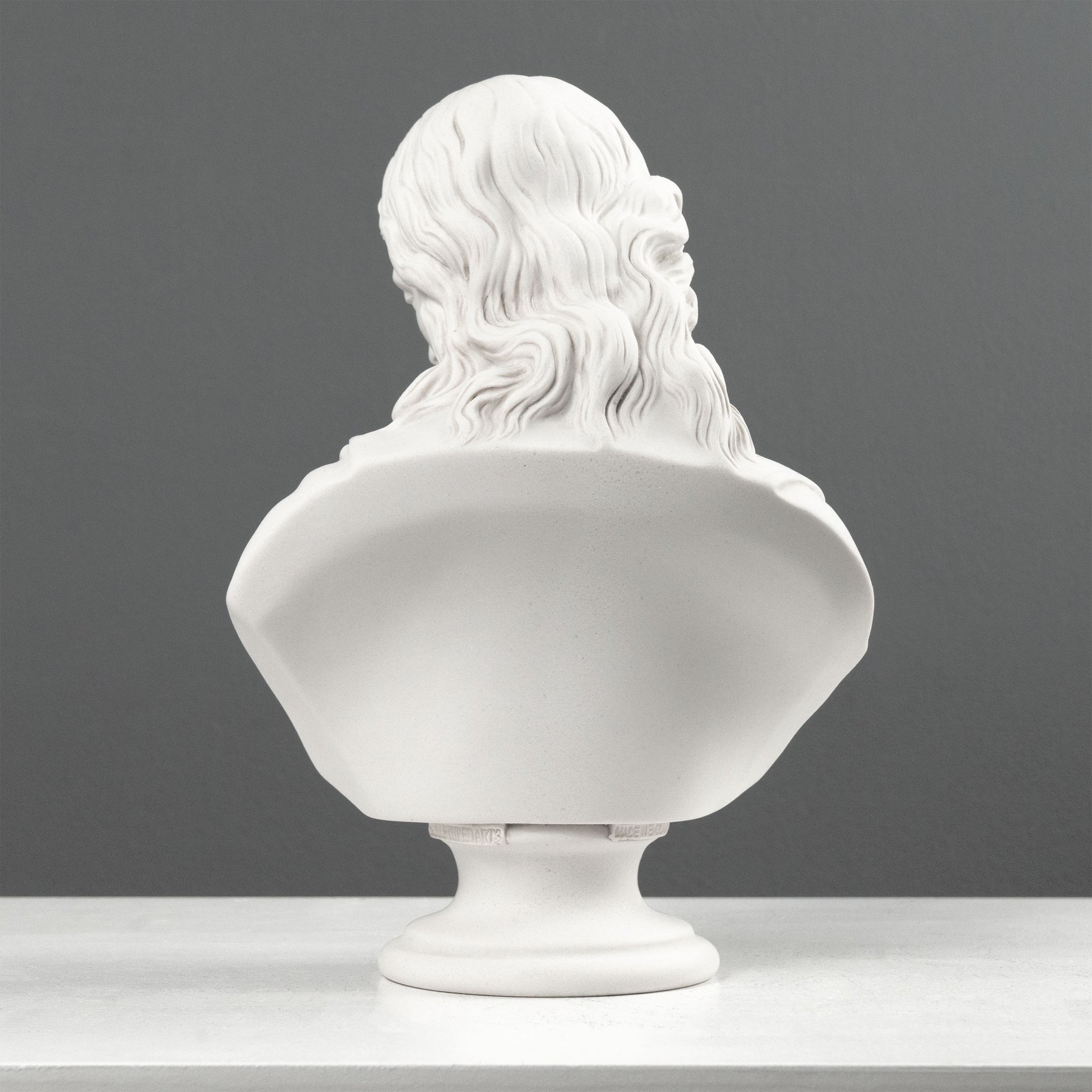 Una representación serena y reverente de Jesucristo, este busto captura la compasión y la fortaleza espiritual del Hijo de Dios. Esculpido en estilo clásico, con la mirada inclinada y detalles finos en el cabello y los ropajes, evoca una profunda sensación de paz, humildad y presencia divina.