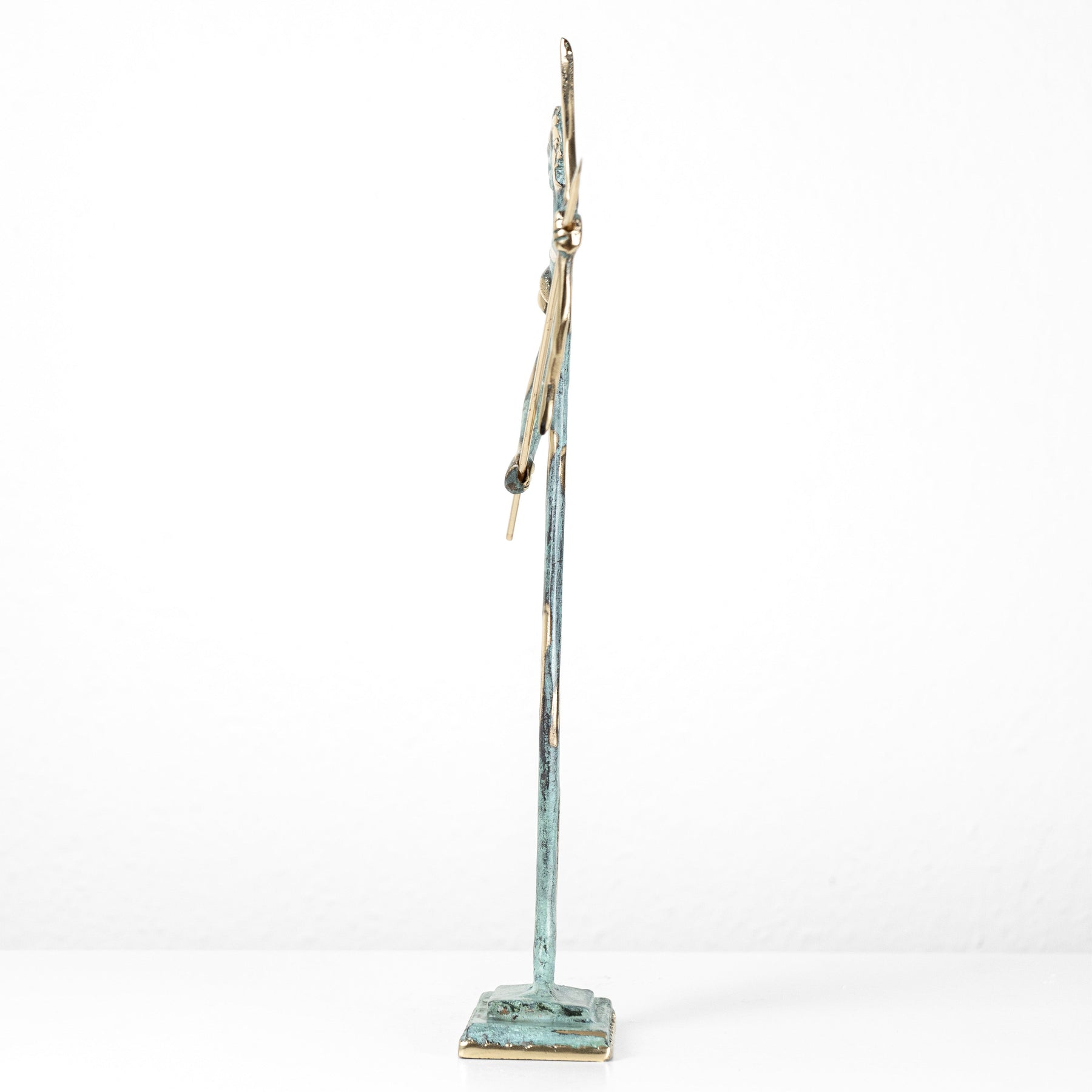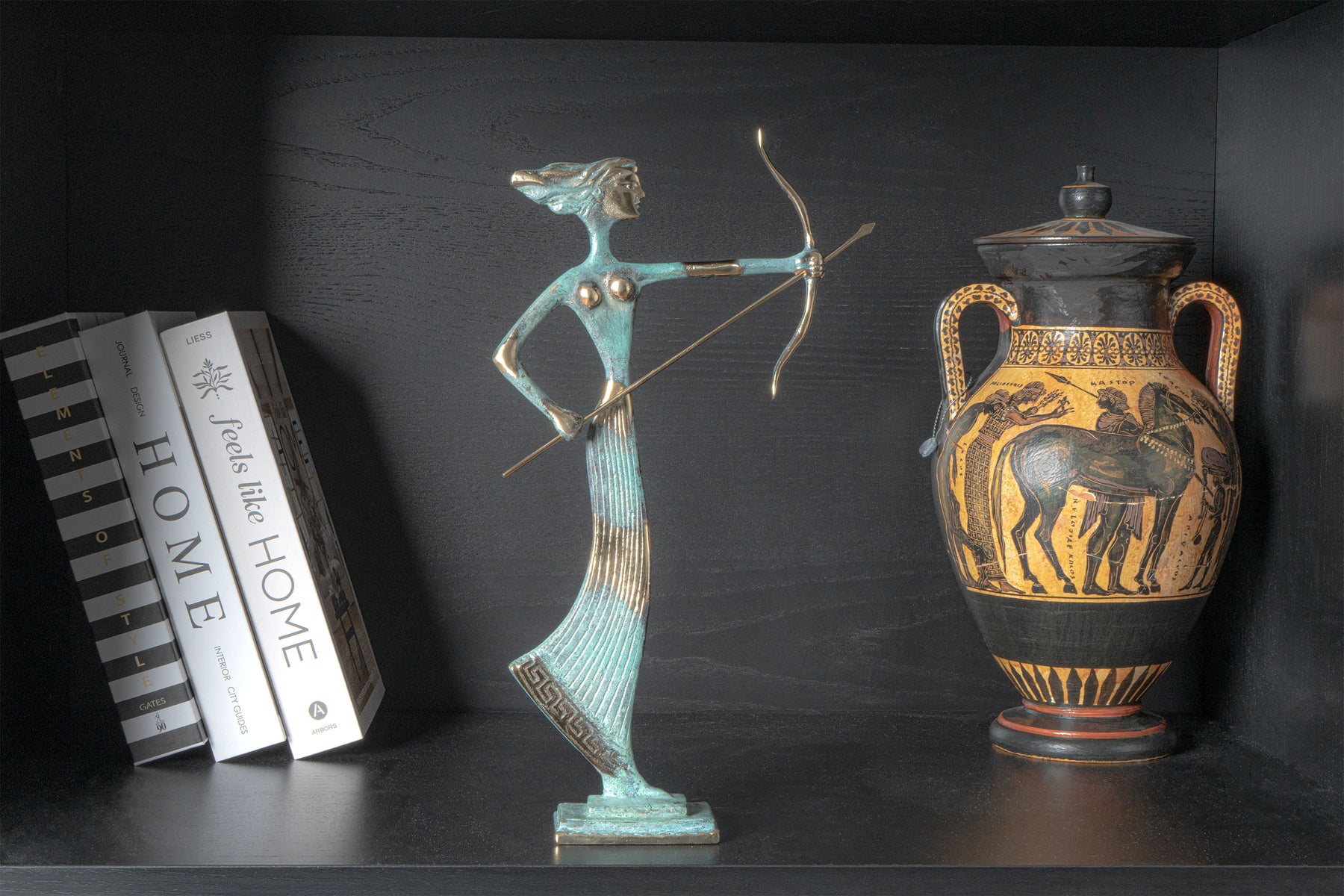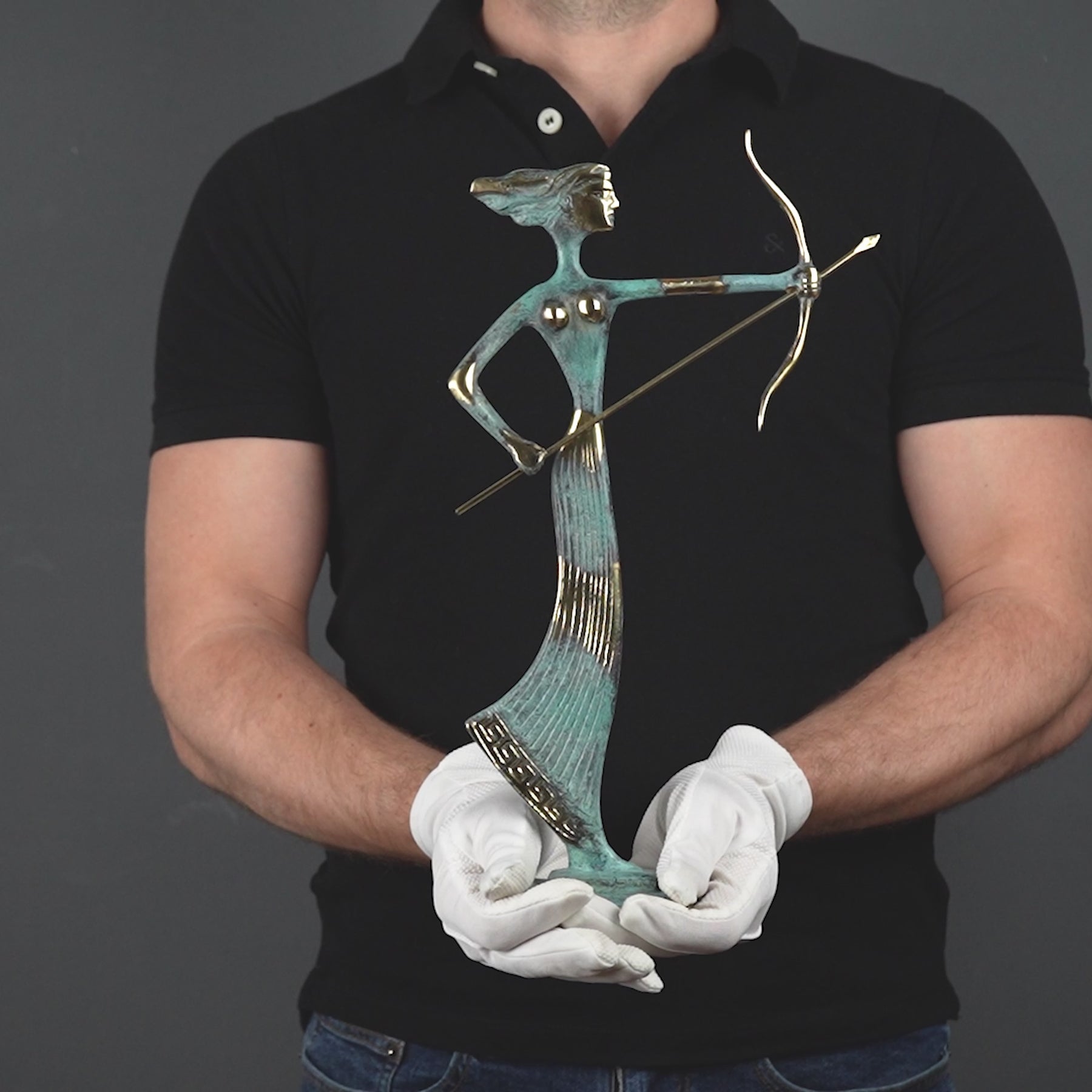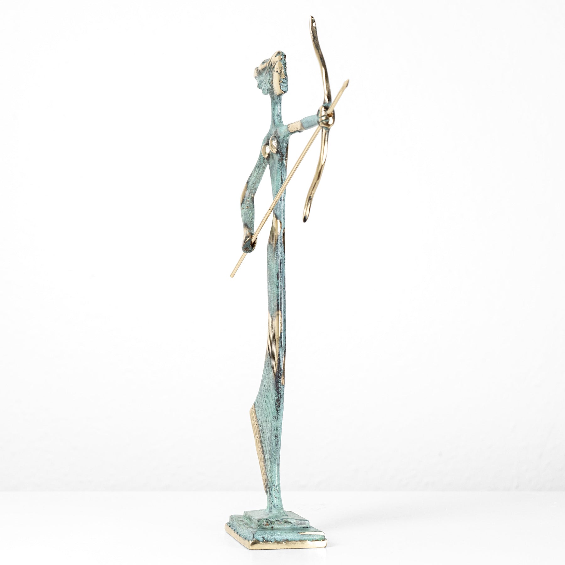 representada en una pose fluida y en movimiento, la diosa transmite agilidad, precisión y elegancia. los detalles refinados y el acabado en latón resaltan su conexión con la naturaleza y su belleza atemporal.