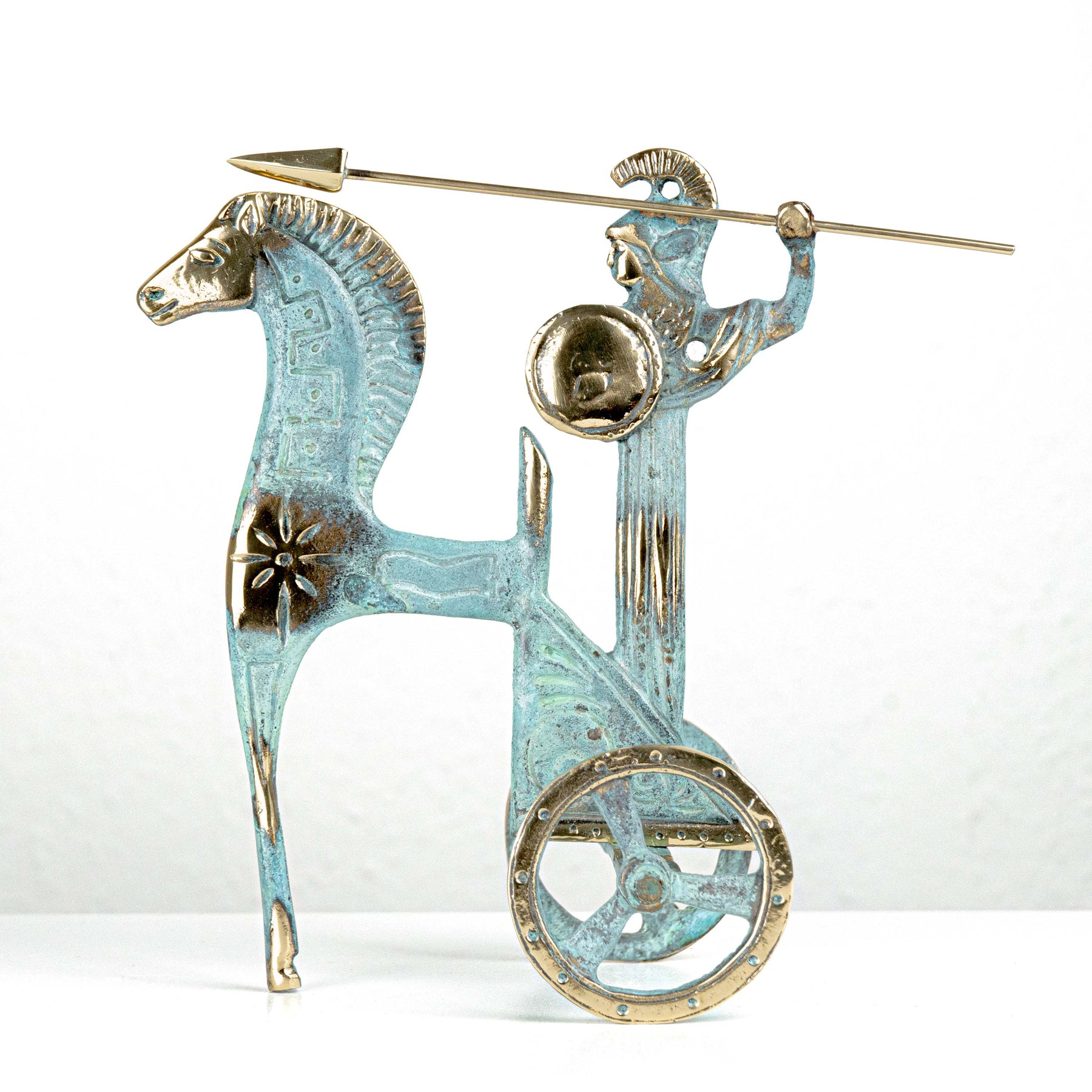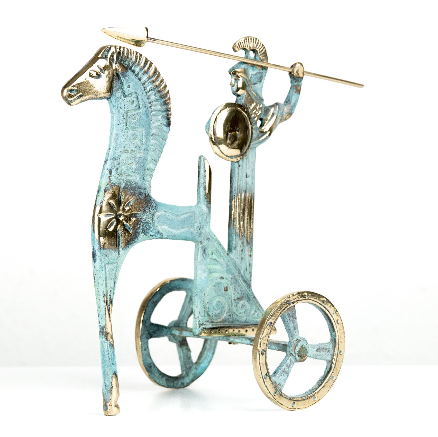 Estatua de Atenea en carro — diosa griega con lanza y escudo (Escultura de latón)