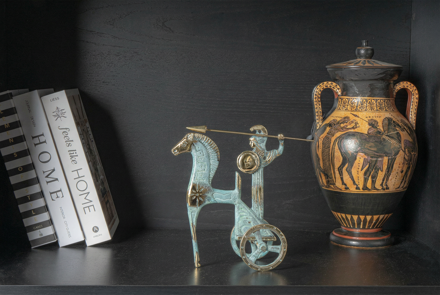• símbolo de sabiduría y poder estratégico, atenea emerge como una presencia imponente en su carro — encarnando la armonía entre intelecto y fuerza que define el ideal clásico.