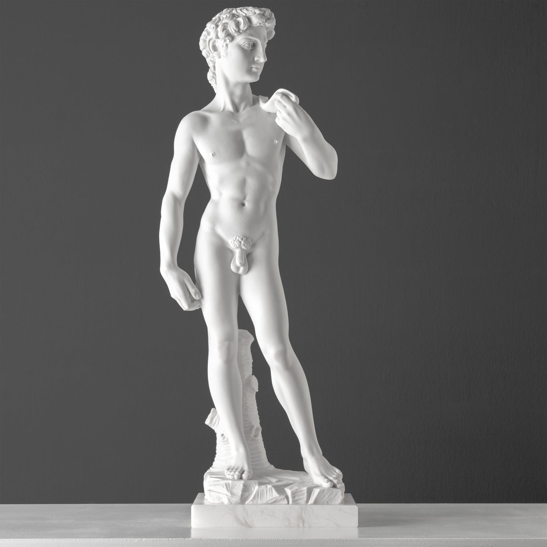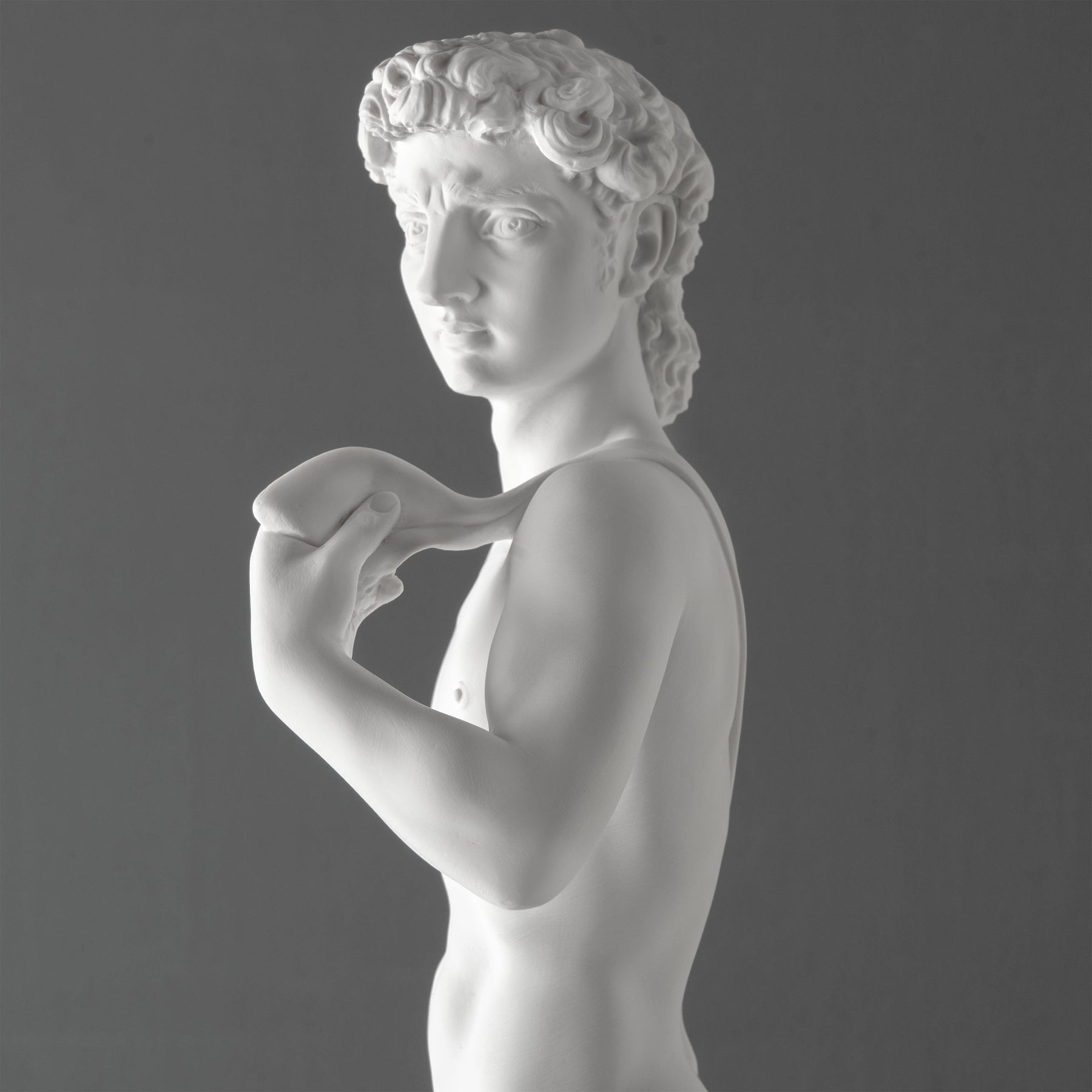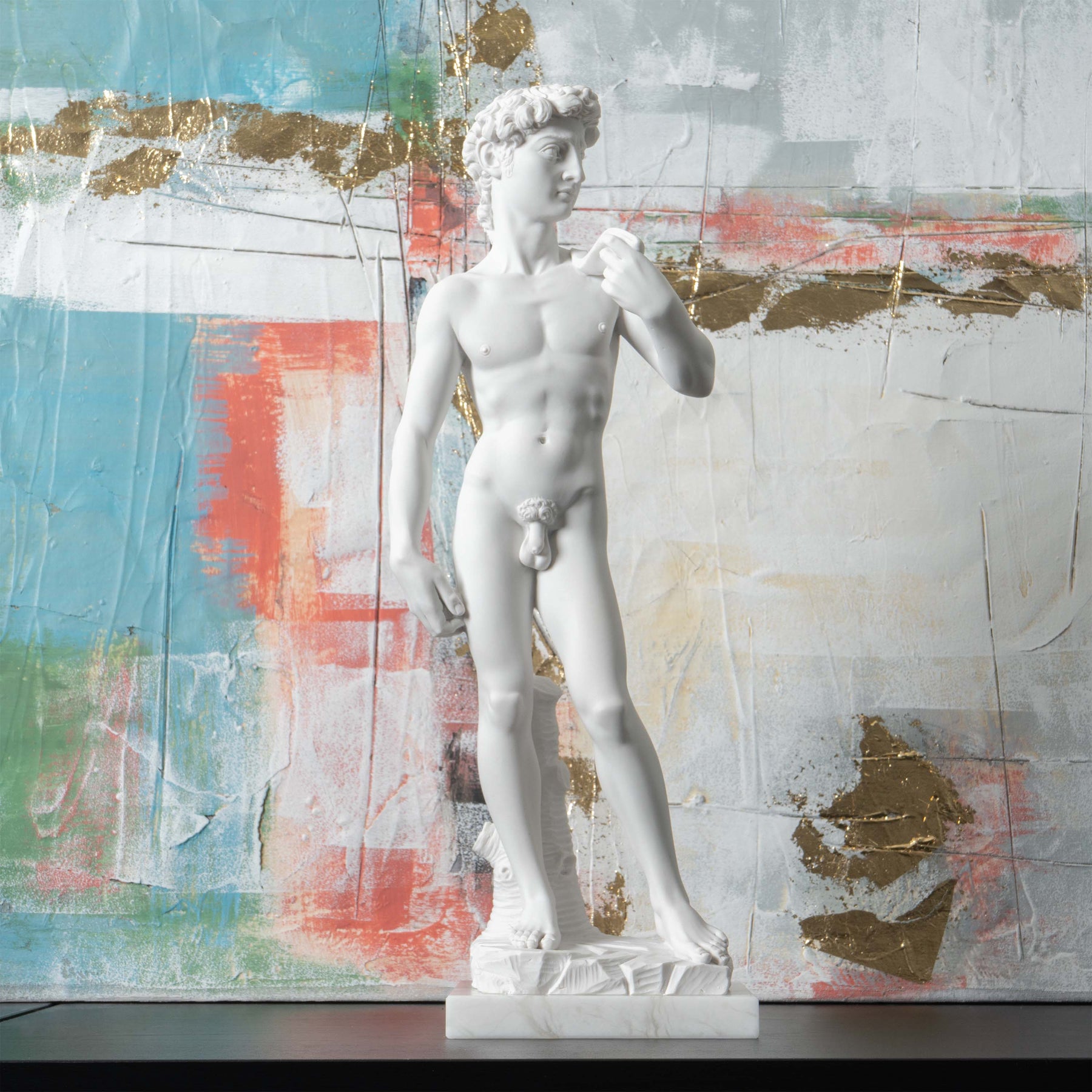 Esta escultura es una reducción del monumental maestro renacentista de Miguel Ángel, tallado en mármol entre 1501 y 1504. El original, de 5,17 metros de altura, representa al héroe bíblico David y sigue siendo uno de los símbolos más icónicos de Florencia, encarnando fuerza, vigilancia e idealismo humano.