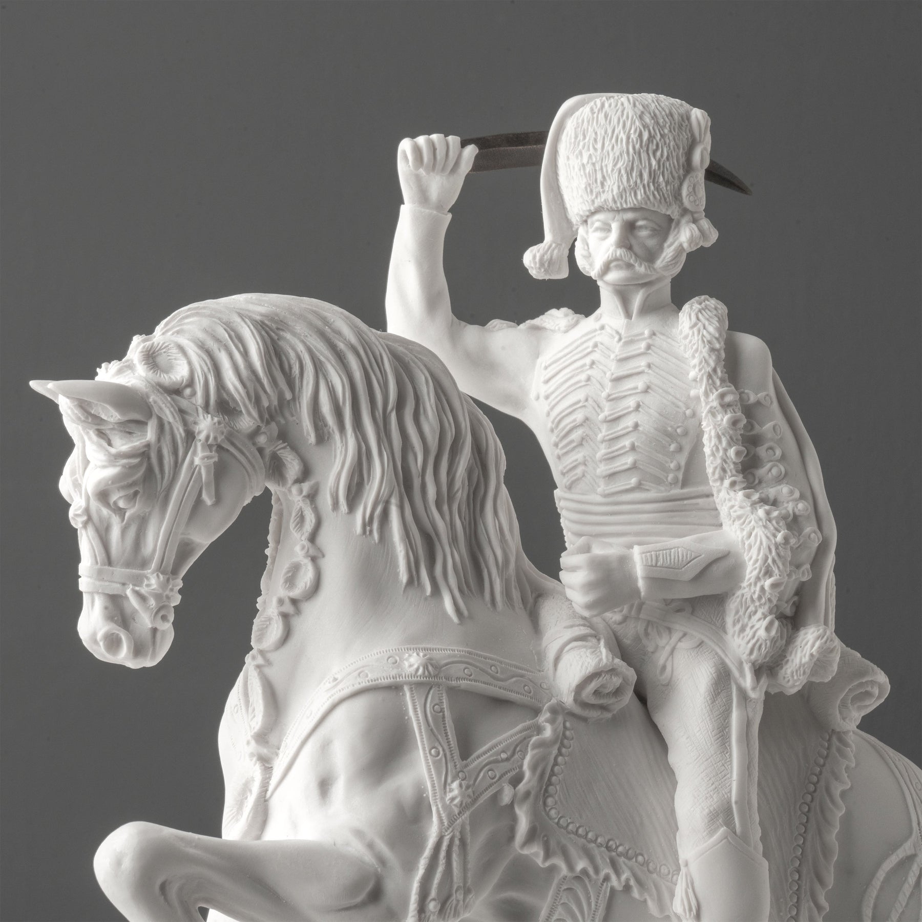 Esta representación escultórica captura a un húsar en pleno mando, sable en alto y montado sobre un caballo encabritado, transmitiendo autoridad, movimiento y el estrecho vínculo entre jinete y montura.