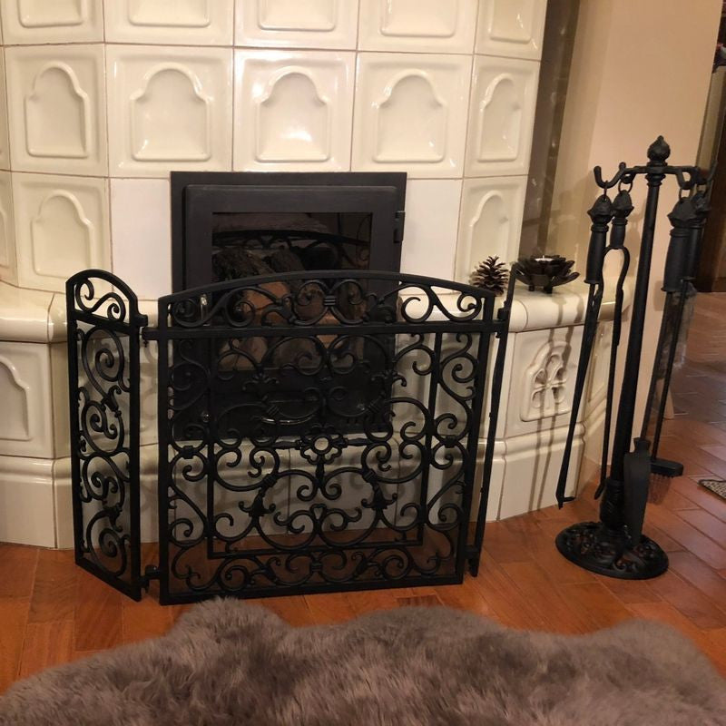 Fabricado en hierro fundido y metal resistente, ofrece estabilidad y durabilidad para uso diario junto a la chimenea.