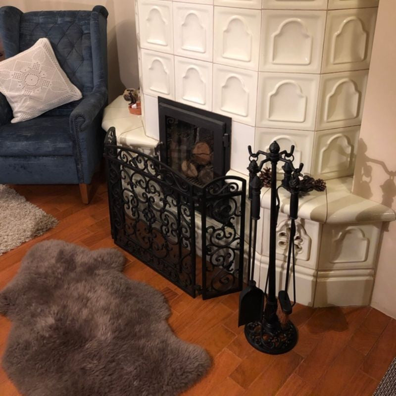 • Juego de herramientas para chimenea en hierro fundido con soporte decorativo. Incluye utensilios esenciales para el cuidado del fuego y mantiene el hogar limpio y ordenado.