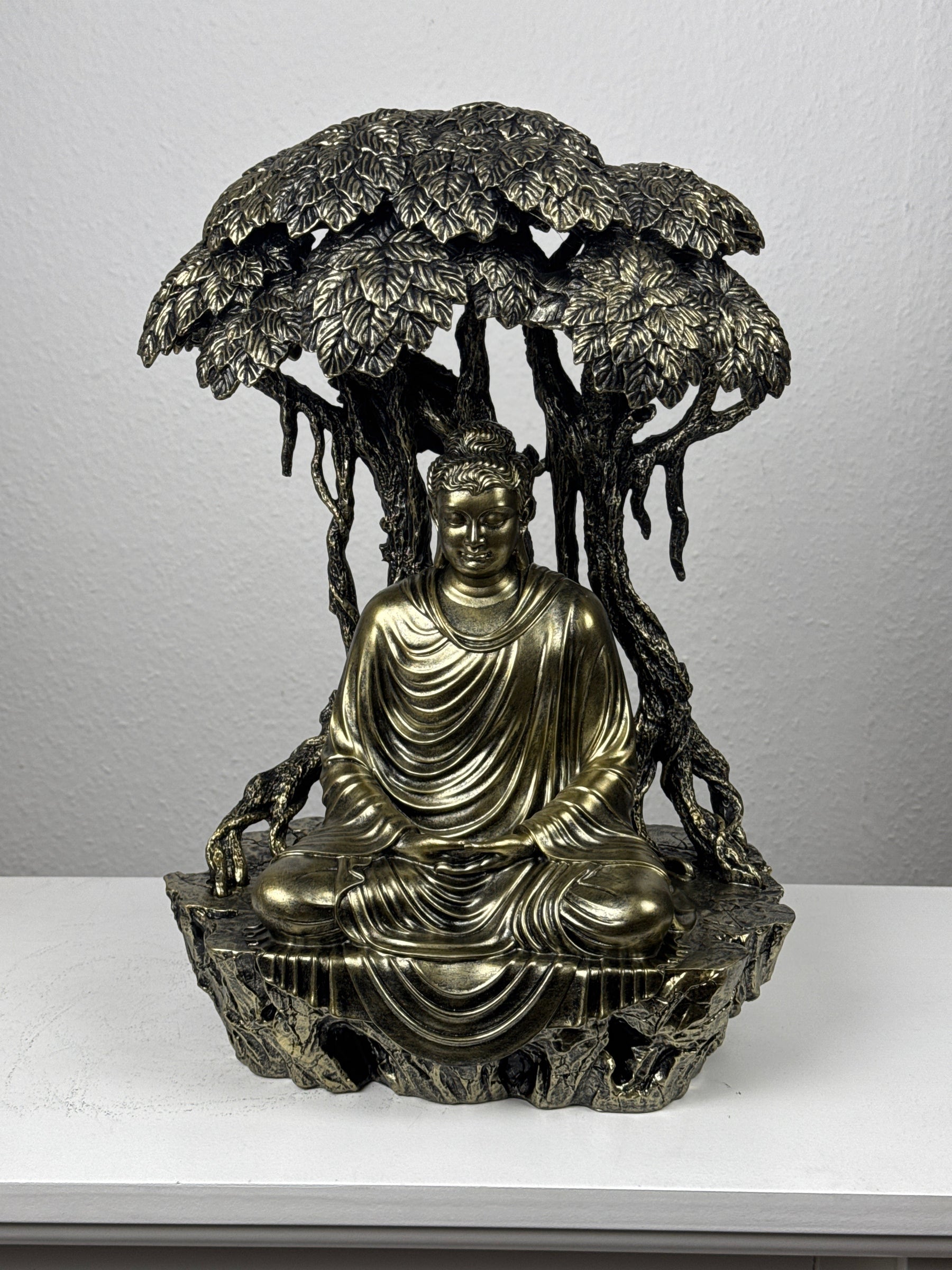 • Esta tranquila escultura representa al Buda sentado en profunda meditación bajo el árbol sagrado Bodhi. Acabada en cálidos tonos bronce, irradia calma y presencia espiritual, lo que la convierte en un elemento central ideal para altares, espacios de meditación o una decoración serena para el hogar.