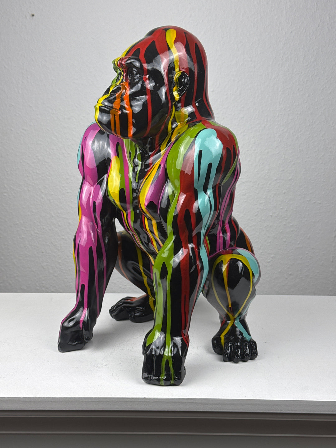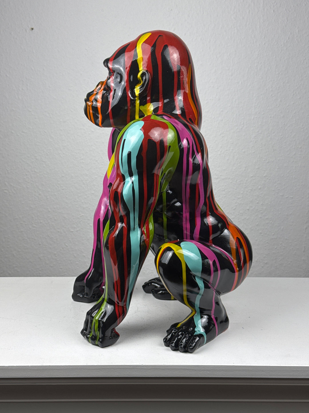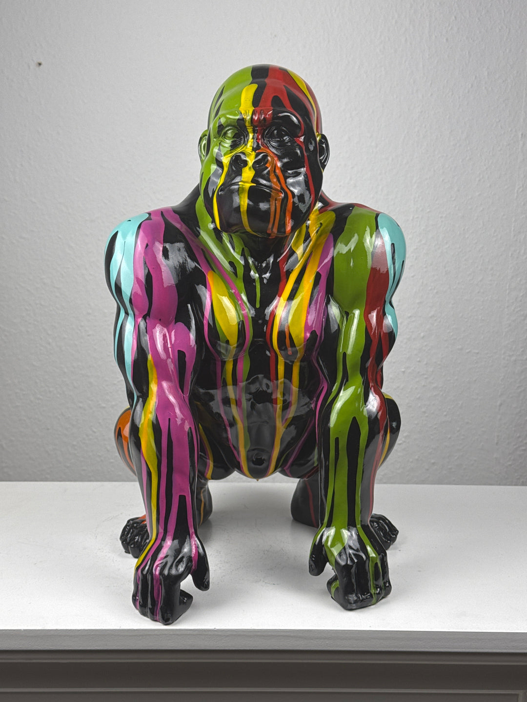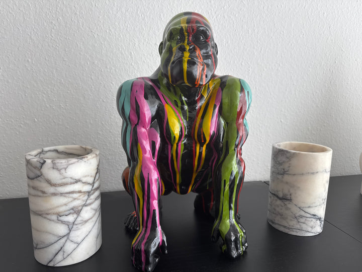 • Esta llamativa escultura de arte pop representa un gorila con un diseño salpicado inspirado en el graffiti. Con su expresiva paleta de colores y su aire urbano, aporta una energía atrevida y un toque artístico a cualquier espacio moderno.