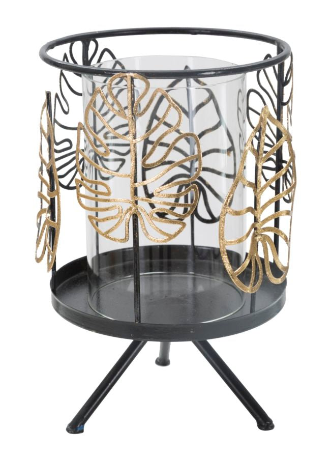 Portavelas Redondo Hoja Tropical Metal y Vidrio